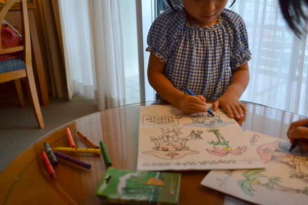 塗り絵や子供用のスポンジなどが入っているセットなのですが、とりあえず塗り絵をしといてもらえれば時間がつぶれるのでかなり助かりましたよ。
